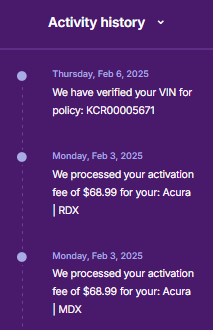 - A timeline of important account events, including payments processed, activation fee status, and policy updates.